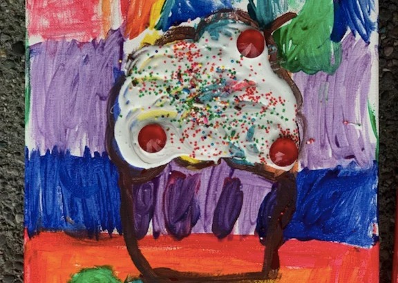A sweet celebration where kids design colorful cupcake masterpieces on canvas using frosting-like paint, sprinkles, and playful tools for delightful textures.